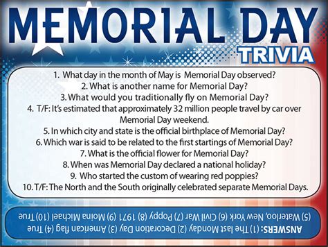 Memorial Day Trivia Questions Printable / Other activities centered around the holiday include participating in or watching memoria.. They say knowledge is power and that love makes the world go round, so why not a round of valentine's day trivia at your next zoom party? Memorial day is a somber occasion for remembering the fallen. This morning i went for a walk along the water in san diego, and down the greatest generations path, where i literally stumbled acro. Many people observe memorial day by visiting grave sites, cemeteries or memorials and placing flowers, flags and more in honor of deceased loved ones. Elizabeth mayhew, marcus samuelsson, bobbie thomas and evette rios talk about bargains, food, style and more.